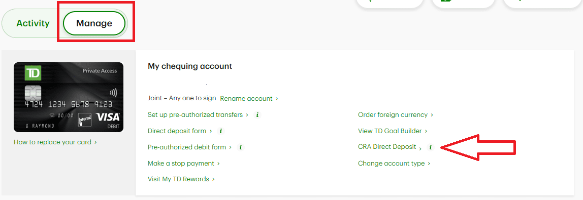From the TD Banking app (desktop or mobile), select your bank account, and then find the “Manage” tab and select CRA Direct Deposit.