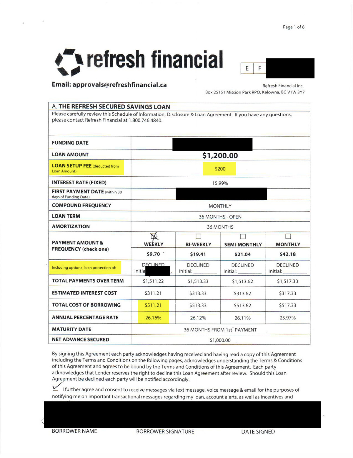 Based on information provided by a client, here’s an example of how these programs work: Our client asked to borrow $1,200. Based on the contract offered (a redacted copy appears below), he will make weekly payments of $9.70 over three years to repay the full $1,200, plus interest, at a quoted rate of 15.99%. However, there is also a loan setup fee of $200. This means that the borrower will pay $511 in interest and fees on a three year loan of $1200, or an equivalent interest of just over 26%.